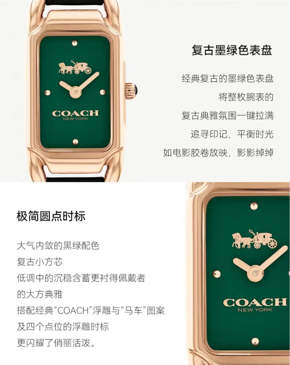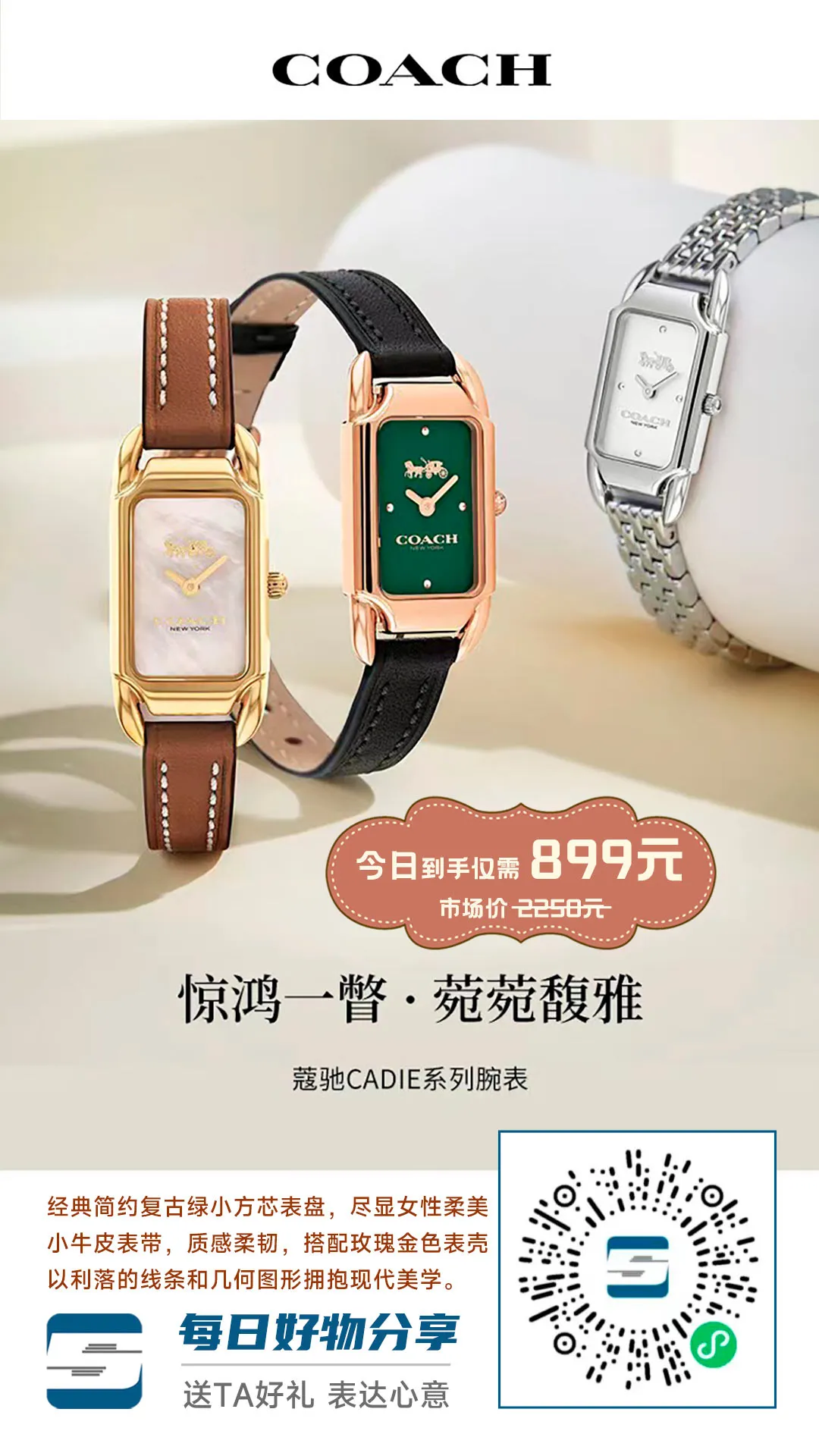 COACH蔻驰经典马车小方芯石英女表,小绿盘和贝母盘都是超级受欢迎的款式~京东自营活动价2050元,今天咱们优品GO乐园活动价仅需要899元!支持专柜验货,送女友送闺蜜超级适合。长按下图自动识别二维码进入小程序购买。